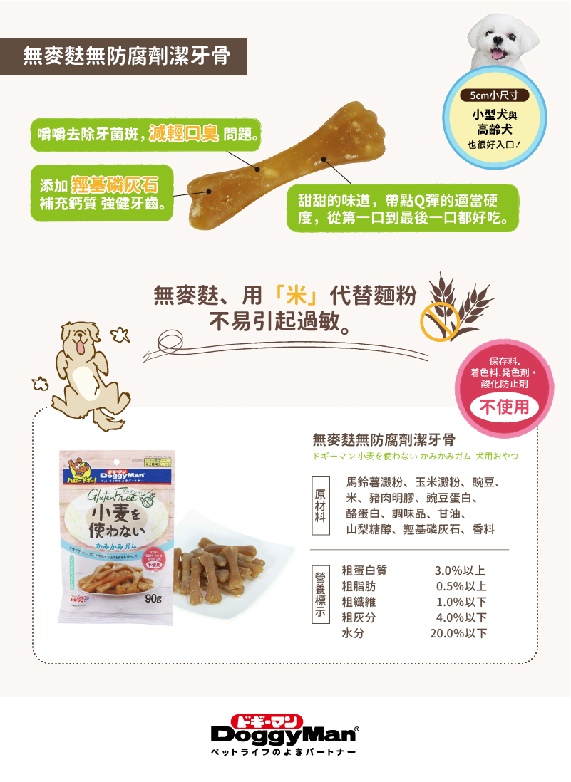 用米完全替代麥粉和麵筋,含有羥基磷灰石成分,可維持口腔牙齒健康。