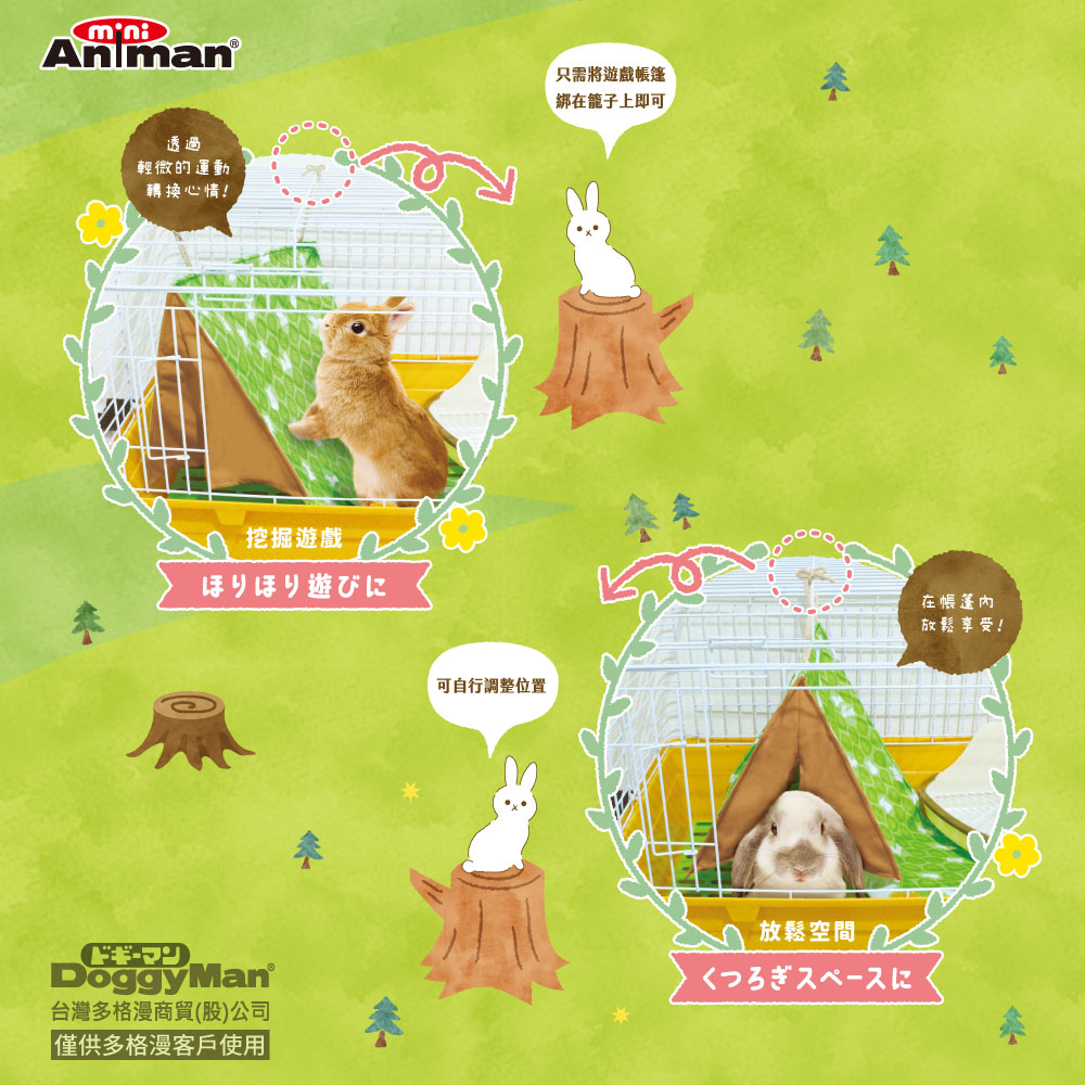 ・帳篷内部非常適合放鬆或玩捉迷藏,帳篷外部適度的坡度旨在激發免子挖掘和嗅探的慾望。