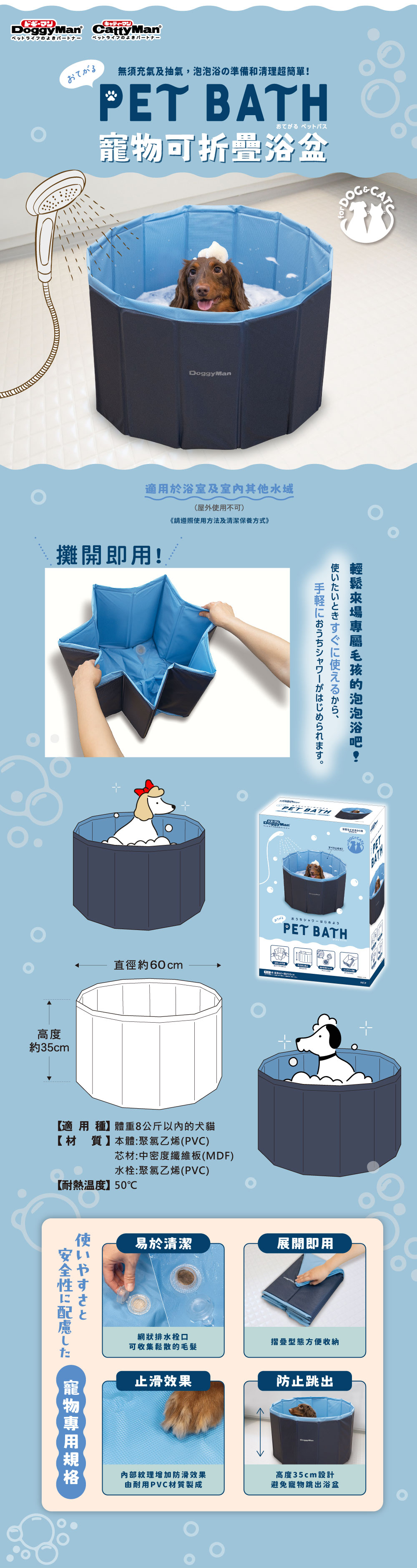・防止跳出,高度35公分,避免寵物跳出浴盆。